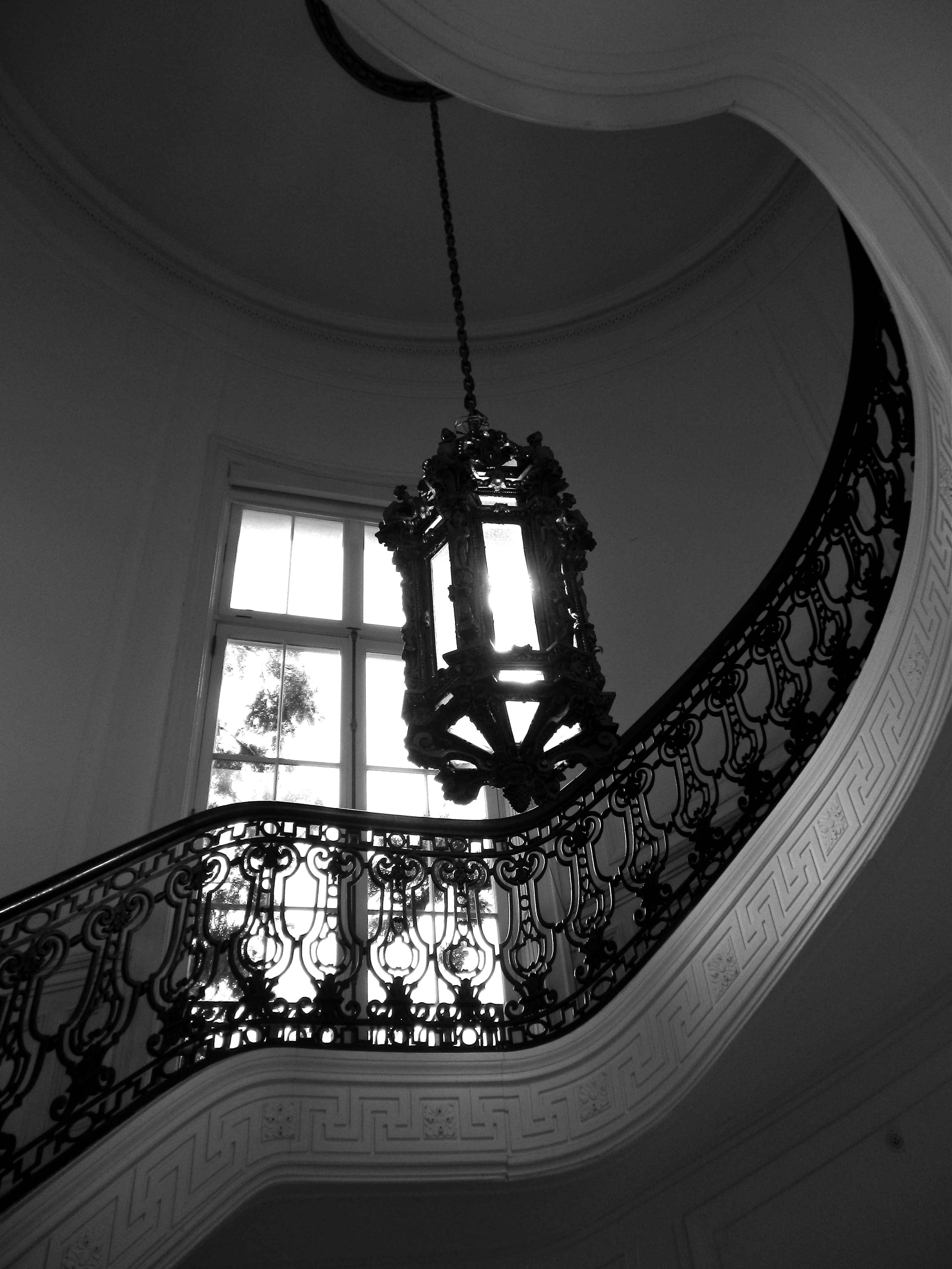 level. If one walks to the right and emerges at the top of those steps, a beautiful, curved stairwell that hugs a large, ornate chandelier can be seen through a white paneled doorway.