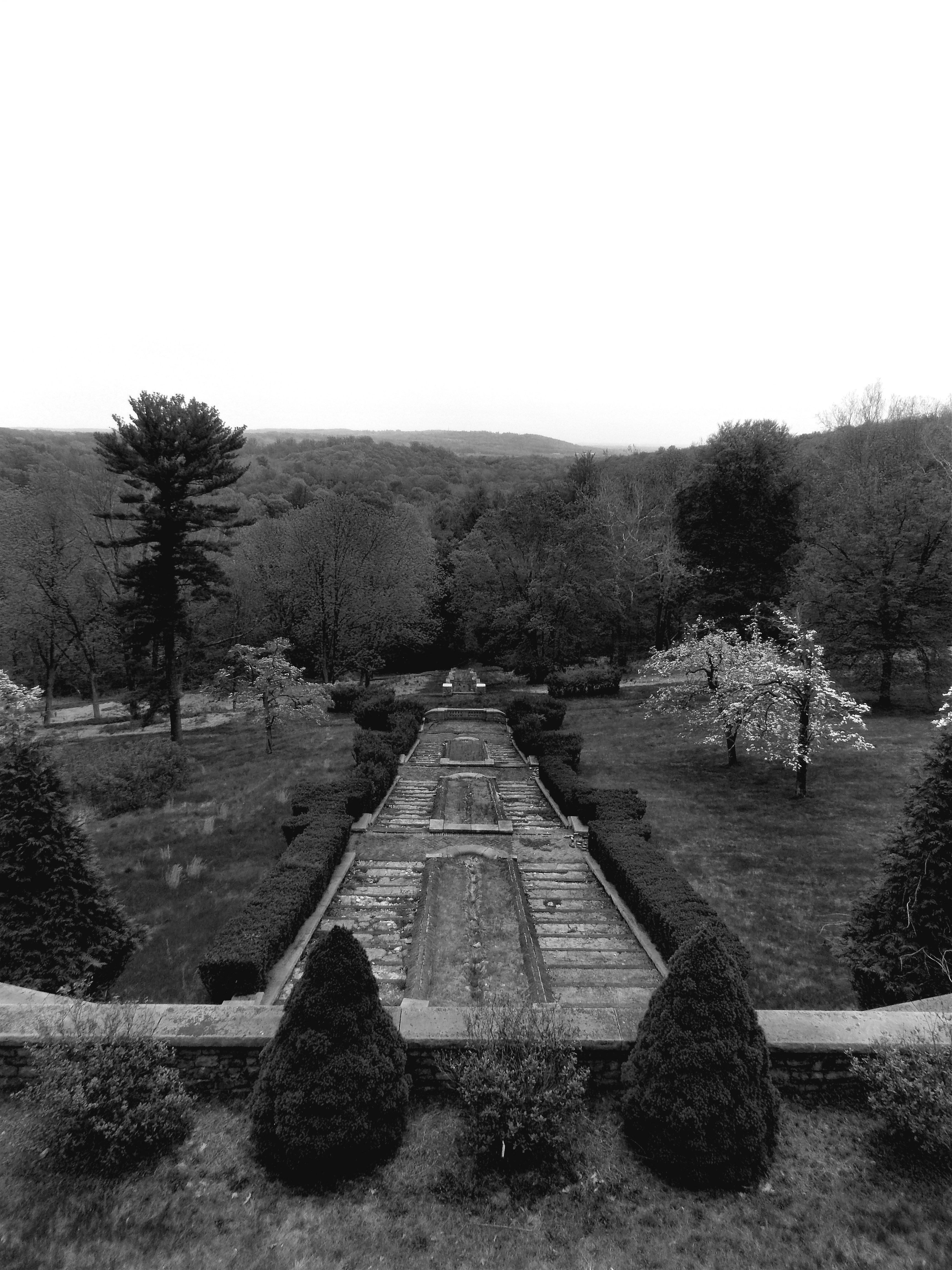 When standing in the courtyard just outside the first floor, it seems that one is standing on a flat piece of land, but in actuality, the basement level is just below housing the Turkish baths and indoor squash court, among other expensive features. Proceeding down the hill from the basement level terrace lined with beautiful arched windows, the remnants of the stately stone and brick stairwell descend to the original driveway and lake below.