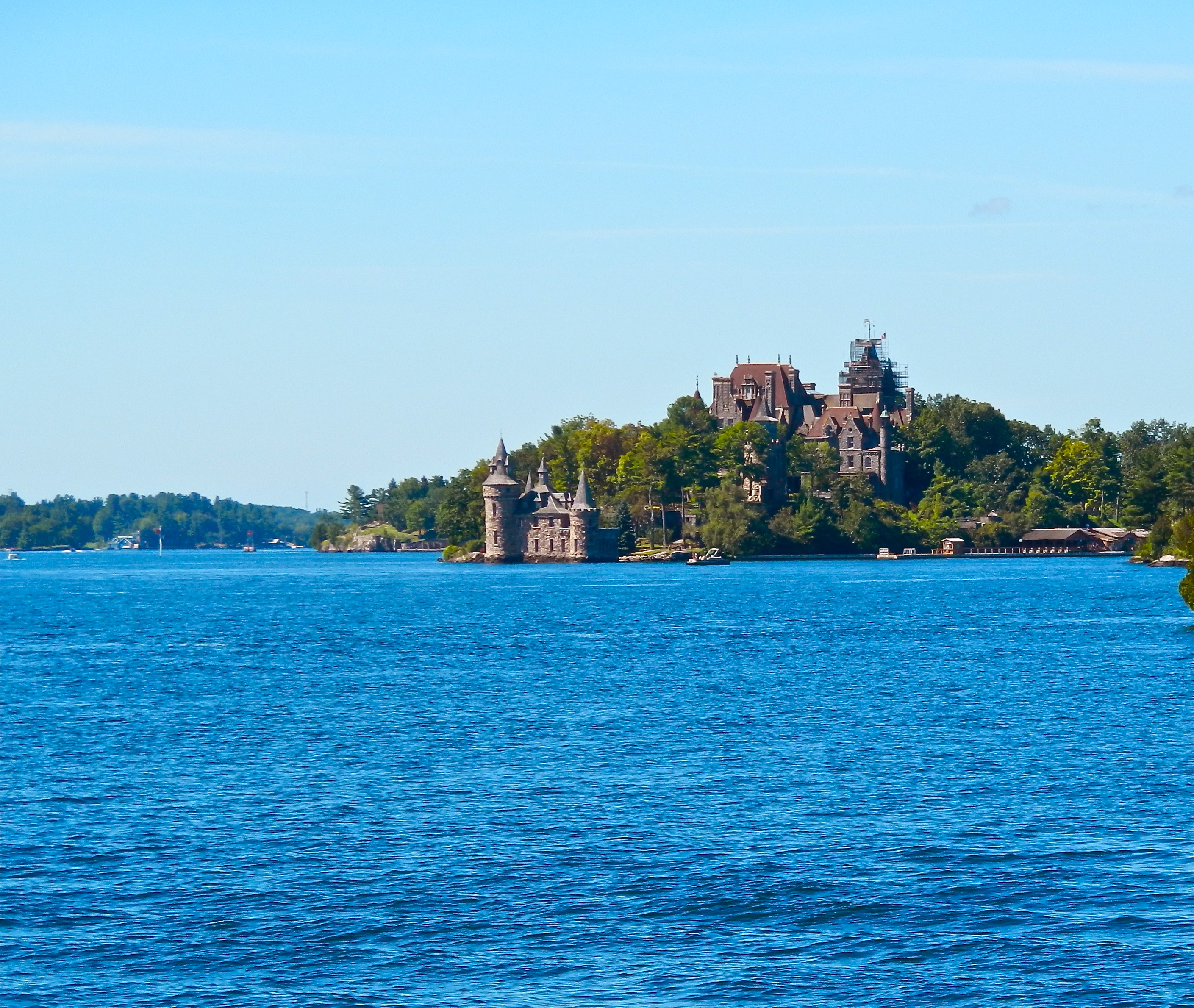 Boldt Castle and Power House in distance across St. Lawrence River.