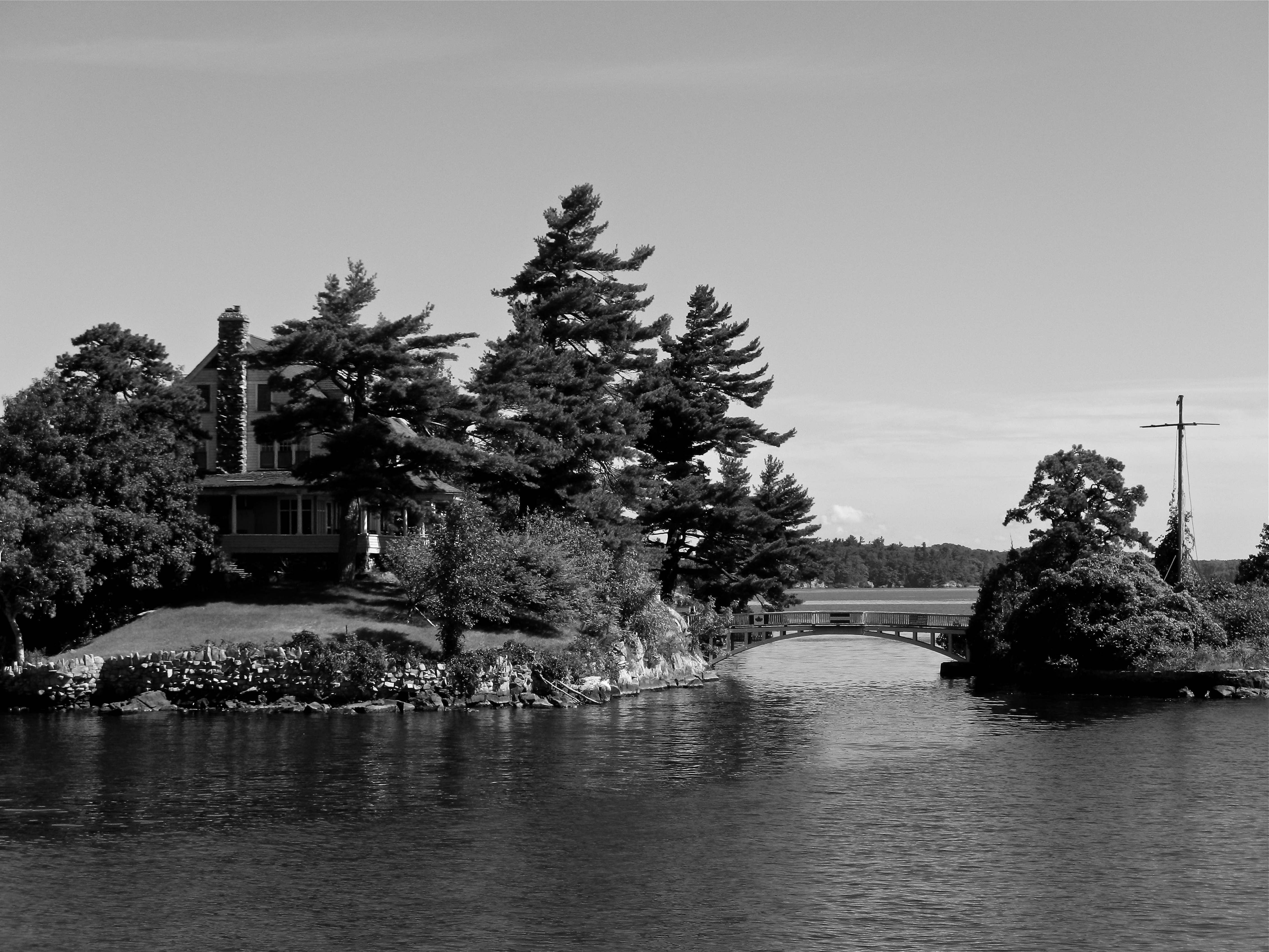 The smallest international bridge in North America. The home site on a Canadian island and has a stepping bridge connecting to a tiny American island.