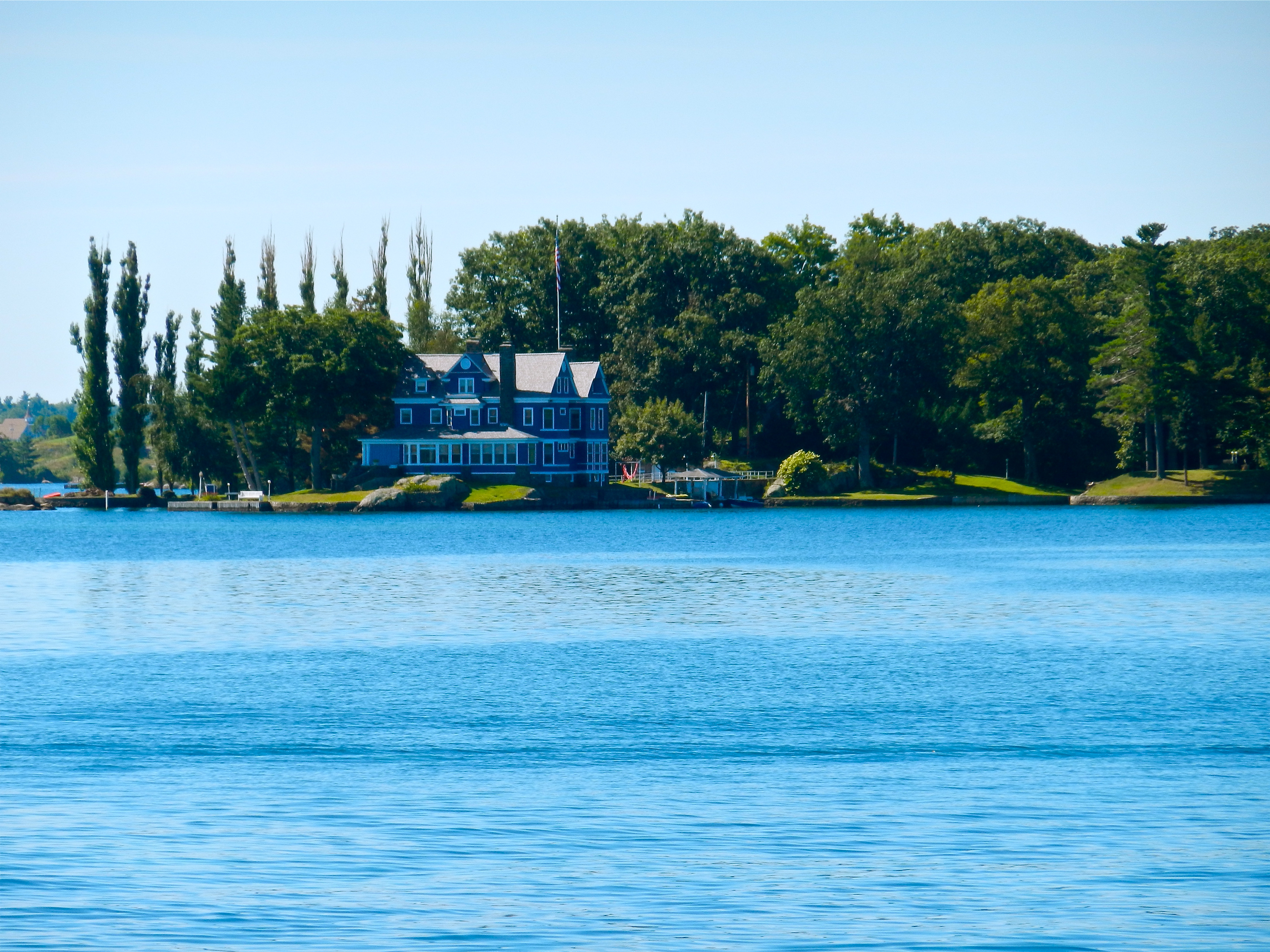 Boldt Castle and Power House in distance across St. Lawrence River.